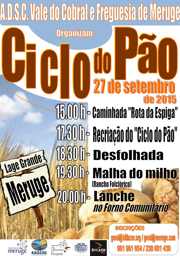 A ADSC de Vale do Cobral e a Junta de freguesia de Meruge, Oliveira do Hospital, vão realizar no próximo domingo a recreação do “Ciclo do Pão”, uma iniciativa que terá lugar, a partir das 15:00 Horas, na Lage Grande. O evento arranca com a caminhada “Rota da Espiga”, que explora os caminhos percorridos pelas carroças puxadas pelos animais e os trilhos apeados pelos moleiros para a distribuição da farinha, e termina com um lanche para todos os participantes, pelas 20h00, também na Lage Grande.