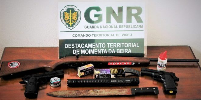 A GNR deteve hoje uma mulher por posse de armas proibidas no concelho de Moimenta da Beira. A detenção aconteceu no âmbito de uma investigação por ameaças com recurso a arma de fogo, os militares da Guarda encetaram diligências policiais que culminaram com o cumprimento de dois mandados de busca, uma domiciliária e outra em veículo, e com a apreensão do seguinte material: uma carabina; uma arma eléctrica (taser); duas pistolas de ar comprimido; uma catana; 40 munições; um carregador e diversas munições de calibre 4,5mm.