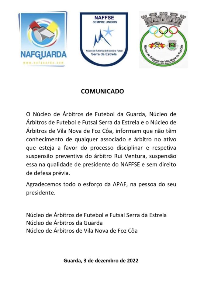O Núcleo de Árbitros de Futebol da Guarda, Núcleo de Árbitros de Futebol e Futsal Serra da Estrela e o Núcleo de Árbitros de Vila Nova de Foz Côa, desmentem o presidente da Associação de Futebol da Guarda quando este referiu ao jornal “O Jogo” que “a maior parte dos árbitros” lhe transmitiu “que o castigo [a suspensão preventiva de 30 dias]” aplicado ao árbitro Rui Ventura “é merecido”, adiantando ainda que é a segunda vez que aquele árbitro “tem um processo”.