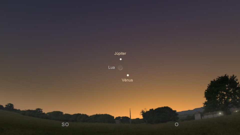 No dia 22, os três objetos astronómicos mais brilhantes do céu à noite reúnem-se, com uma separação de menos de 7 graus. Neste dia, um fino crescente da Lua estará a 3,5 graus de Júpiter e a 4 graus de Vénus, mais ou menos a meio entre os dois planetas. A Lua (que apesar de estar ainda muito pouco iluminada, tem já magnitude -8,2), Vénus (com magnitude -3,9) e Júpiter (com magnitude -2,1) são, respetivamente, o primeiro, segundo e terceiro objetos mais brilhantes do céu à noite.