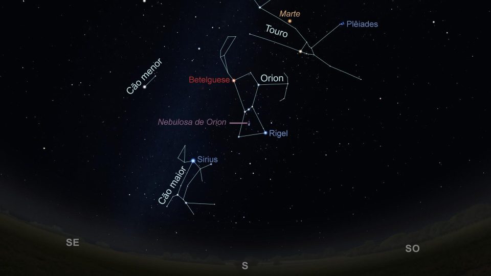 As três estrelas alinhadas, a meio do retângulo, desenham o cinto de Orion, que por cá também são conhecidas por Três Marias. Logo abaixo destas está a espada de Orion. A olho nu, num céu escuro, à volta da estrela do meio da espada vê-se uma nebulosidade, que é a Grande Nebulosa de Orion, uma das maiores maternidades de estrelas das redondezas. Daqui a umas dezenas de milhões de anos dará origem a um enxame de estrelas semelhante às Plêiades, na constelação do Touro, constelação onde também encontramos o planeta Marte.