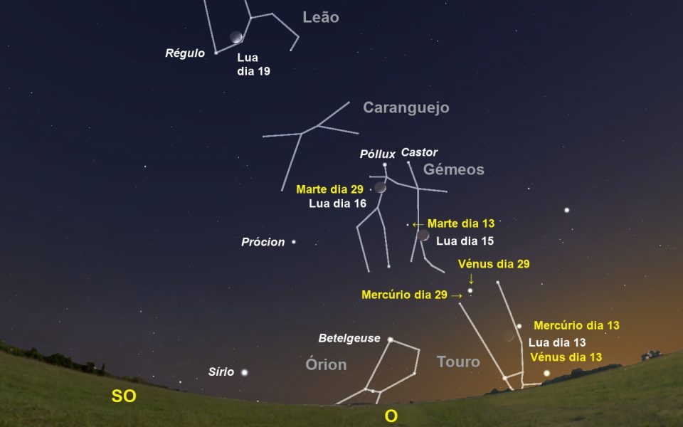 De igual modo, entre as noites de dia 15 e 16 iremos ver a Lua deslocar-se da direita para a esquerda de Marte, planeta que se encontra atualmente junto à constelação dos Gémeos.