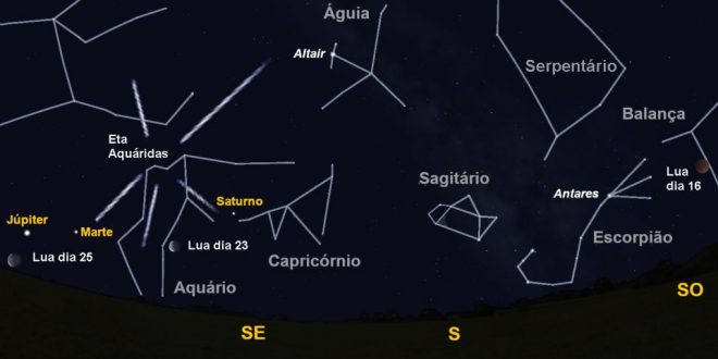 Figura: céu a sul pelas quatro horas e meia da madrugada de dia 16. Igualmente é visível a posição da Lua nas madrugadas de dia 23 e 25 e o radiante da chuva de estrelas Eta Aquáridas.