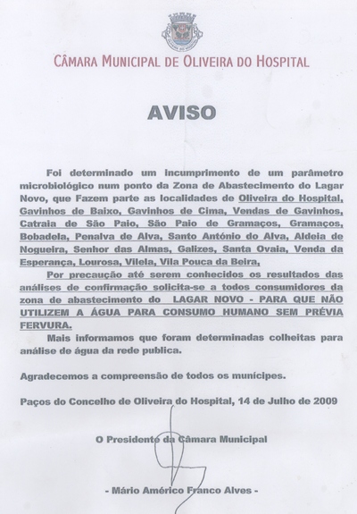 Assinado pelo próprio presidente da Câmara Municipal de Oliveira do Hospital, o aviso identifica problemas na água da rede pública nas localidade de Oliveira do Hospital, Gavinhos de Baixo, Gavinhos de Cima, Vendas de Gavinhos, Catraia de São Paio, São Paio de Gramaços, Gramaços, Bobadela, Penalva de Alva, Santo António do Alva, Aldeia de Nogueira, Senhor das almas, Galizes, Santa Ovaia, Venda da Esperança, Lourosa, Vilela e Vila Pouca da Beira.