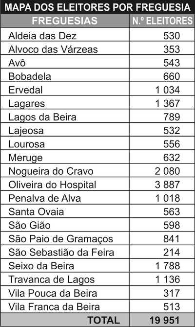 A freguesia sede de concelho e as congéneres de Nogueira do Cravo e Seixo da Beira são as que registam um maior aumento nos seus cadernos eleitorais.