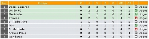 A Associação Desportiva de Lagares da Beira iniciou campeonato a ganhar e está no comando da tabela com seis pontos.