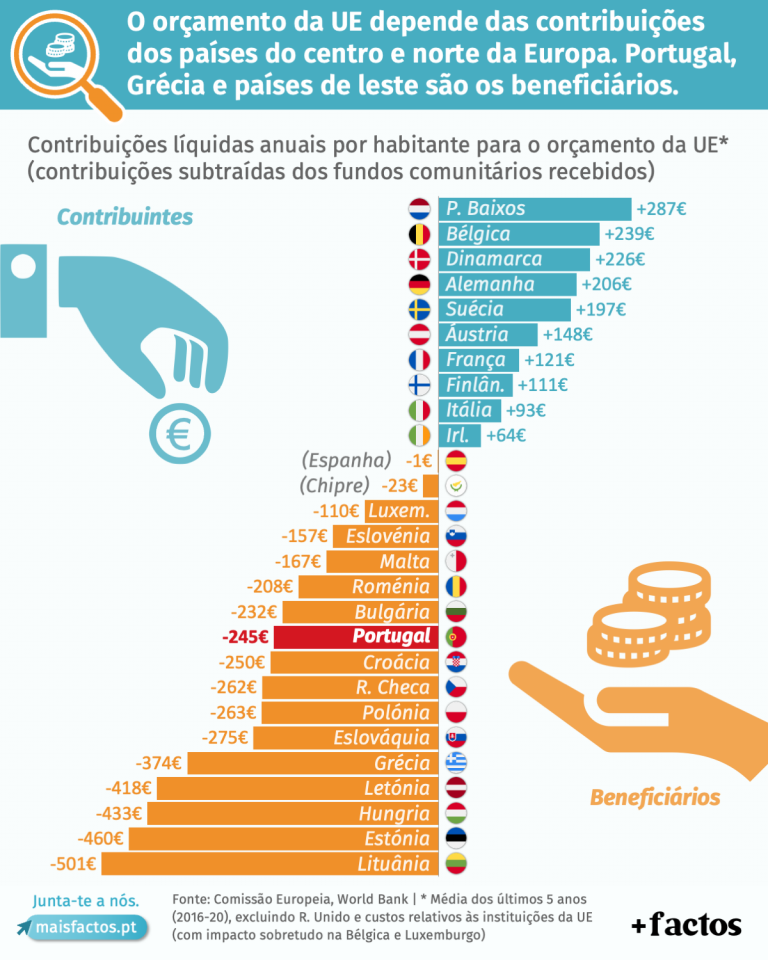 Dos 27 países da UE, existem apenas 10 estados-membros com contribuições líquidas positivas (maioritariamente do centro e norte da Europa), sendo que os restantes 17 são beneficiários, onde se destacam Portugal, Grécia e países de leste. A despesa da União Europeia em 2020 ascendeu os 170 mil milhões de euros, cuja aplicação incide maioritariamente em iniciativas de desenvolvimento e crescimento económico, com particular ênfase para os países mais pobres, onde Portugal inclui-se.