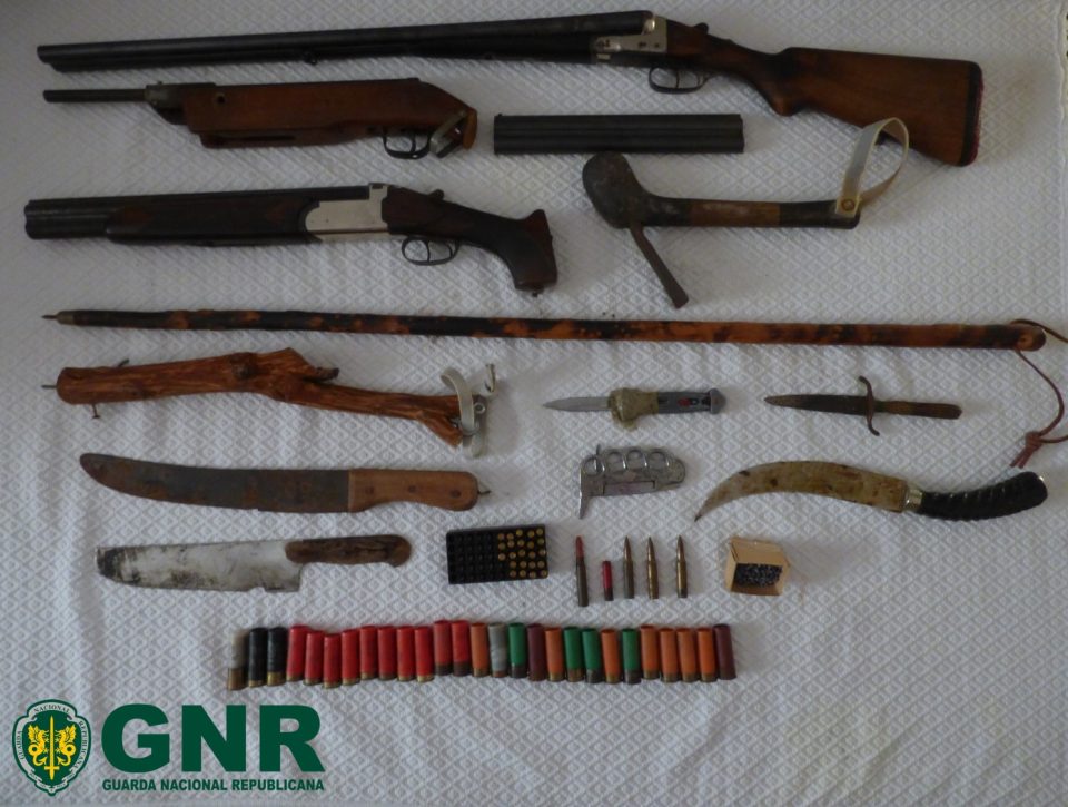 Na sequência das diligências policiais foram efectuadas duas buscas, uma domiciliária e a outra em veículo, que culminou na apreensão de uma arma de fogo, 9 munições, uma faca de mato alterada, uma catana, um machado de corte, uma faca rectangular, um machado lâmina c/cutelo de ferro, dois espetos rectangulares, um pau com parafusos na ponta, uma faca artesanal, uma catana, um cutelo, um objecto em madeira (tipo bastão) com parafusos, uma vara em madeira com ponta metálica, uma sachola em forma de moca, uma soqueira (Boxer) com lâmina, uma caixa com 23 munições, uma arma de ar comprimido com o cano e coronha cortados, parte dos canos (serrados) de uma arma, uma espingarda, uma caixa com chumbos para arma de ar comprimido, dois sabres, cinco munições de diferentes calibres, cinco artefactos pirotécnicos, uma espingarda com os canos serrados, encontrando-se a mesma municiada e em posição de fogo e uma bolsa em tecido.