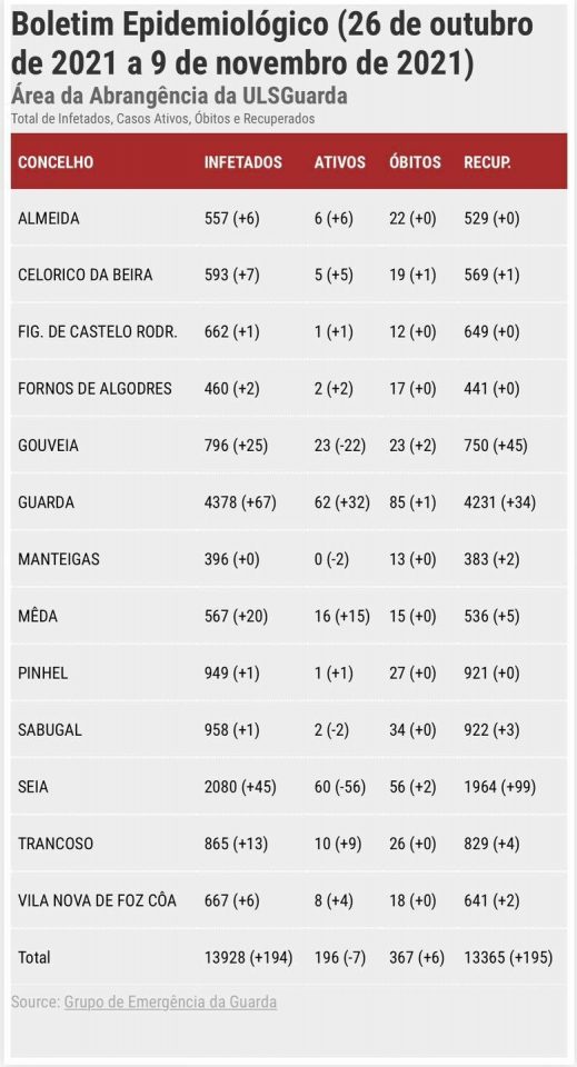 O concelho de Seia e Gouveia registaram, nos últimos 14 dias, quatro óbitos, dois em cada município, dos seis assinalados na área da ULS da Guarda, devido à COVID-19. No município de Celorico da Beira, um paciente que não resistiu à doença, o mesmo acontecendo no concelho da Guarda. Ainda assim, o número de infectados desceu de 203 para 196 no território da ULS Guarda.