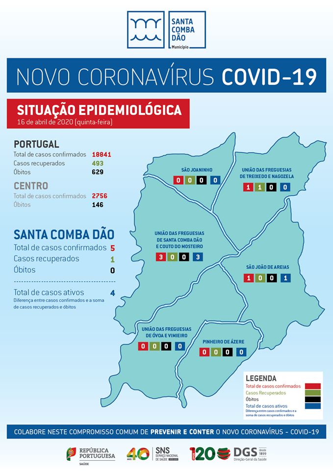 A Câmara Municipal de Santa Comba Dão informou hoje o quinto caso positivo da COVID-19 no concelho. Mas, ao mesmo tempo, a autarquia deu também a conhecer que existe já um paciente no município que venceu o novo coronavírus. Há também quatro casos em vigilância activa. “Clarifica ainda, que as informações prestadas sobre este assunto, nos canais oficiais do município, sê-lo-ão apenas, após confirmação oficial dos dados pelas entidades competentes”, frisa a autarquia.