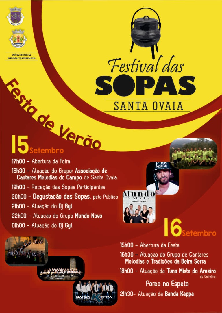 Santa Ovaia, em Oliveira do Hospital, já tem alinhado o cartaz de mais uma edição do tradicional “Festival das Sopas”, este ano agendado para os próximos dias 15 e 16, e que se está a constituir como uma imagem de marca daquela localidade. O programa arranca no sábado (15), pelas 17h00 e prolonga-se até às 21h30 de domingo (16) com encerramento a cargo da banda Kappa. Se as sopas são o atractivo principal, o festival não dispensa a animação musical, nem o também famoso porco no espeto. Um festival é assim.