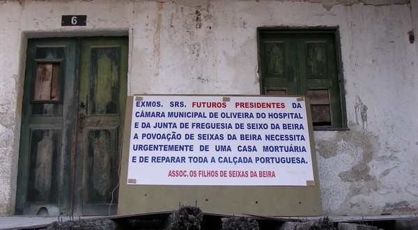 Nas Seixas da Beira, uma aldeia da freguesia de Seixo da Beira onde o tempo parece ter parado, uma intitulada associação de filhos da terra faz – conforme revela a imagem – duas reivindicações ao próximo presidente da Câmara de Oliveira do Hospital: a construção de uma casa mortuária e a reparação de toda a calçada portuguesa que “cobre” as ruas e vielas daquela que deverá ser com certeza uma das aldeias com menos desenvolvimento e mais problemas sociais do espaço europeu.