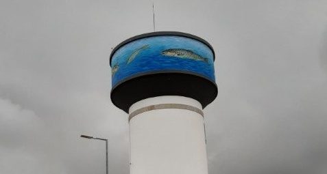 Então, um dia destes, saímos de casa e, apesar da pressa que a hora do trabalho aproximava-se, passámos naquela zona do Quartel dos Bombeiros Voluntários, em Oliveira do Hospital, e da Rotunda da suposta mãe já enferrujada e enroscada no suposto filhote e também ele já enferrujado. E por aí estacionámos para olhar o alto depósito da água pública, ali existente há décadas e que agora exibe uma pintura já completa, a cores quentes, no seu bojo superior completamente decorado, a toda a volta. E lá vimos, com mais atenção que antes, os azuis das pretensas águas e vimos peixes, vários peixes pintados com alguma fidelidade formal, como está a truta virada mais a Nordeste do bojo do depósito. Nós sempre gostámos de trutas e de todas as espécies e cores… Ficámos sensibilizados. E agradados também que agora poderemos mirar a obra pictórica ao por ali passarmos e até mesmo um pouco desde nossa casa.
