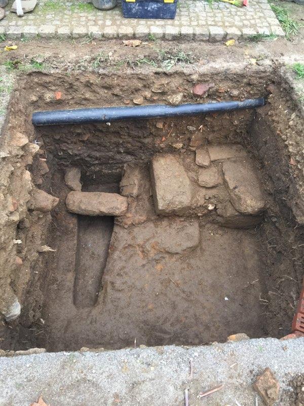 Aspecto de uma das prospecções de Novembro de 2016, observando-se parte de uma sepultura antropomórfica (à esquerda)
