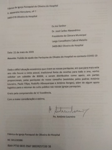O pedido inicial de apoio da Fábrica da Igreja Paroquial de Oliveira do Hospital à Câmara Municipal no contexto da COVID-19 que terminou com a atribuição de um subsídio de 6600 euros às paróquias assistidas por três padres era inicialmente de oito mil euros e incluía mais um pároco. O apoio, porém, foi aprovado, com o voto contra da vereadora do PSD, apenas para as paróquias dos padres António Loureiro, Paulo Filipe e Rodolfo Albuquerque, excluindo o padre António Borges de Carvalho que, segundo o Anuário Católico, aos 80 anos, é pároco nas localidades oliveirenses de São Paio de Gramaços e Santa Ovaia.