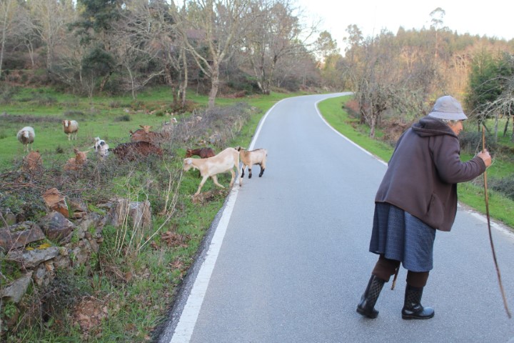 É uma espécie de pastora comunitária, mas, em vez de ser em cada semana uma pessoa a sair para os campos, é sempre ela. Diz que não suporta estar em casa. Nestes pastos, ao menos respira ar livre na companhia dos animais. E mostra ter uma pontaria digna de realçar; umas irrequietas cabritas tentaram escapar para o meio da estrada. Pegou numa pequena pedra e, com grande destreza, atirou-a mesmo ao lado das fugitivas para as meter na linha, assustando-as, não foi para as atingir. Contou que, já em miúda, depois da escola, guardava gado, prática que adquirira dos pais e avós. Só se queixa das pernas, pois tem um bocado de dificuldade em mover-se sem a ajuda dos cajados. De resto, denota uma grande serenidade, espelhada no rosto e no sorriso. E vê-se que não renega ter este espírito solidário para com as pessoas da aldeia onde habita, ajudando a cuidar dos seus animais.