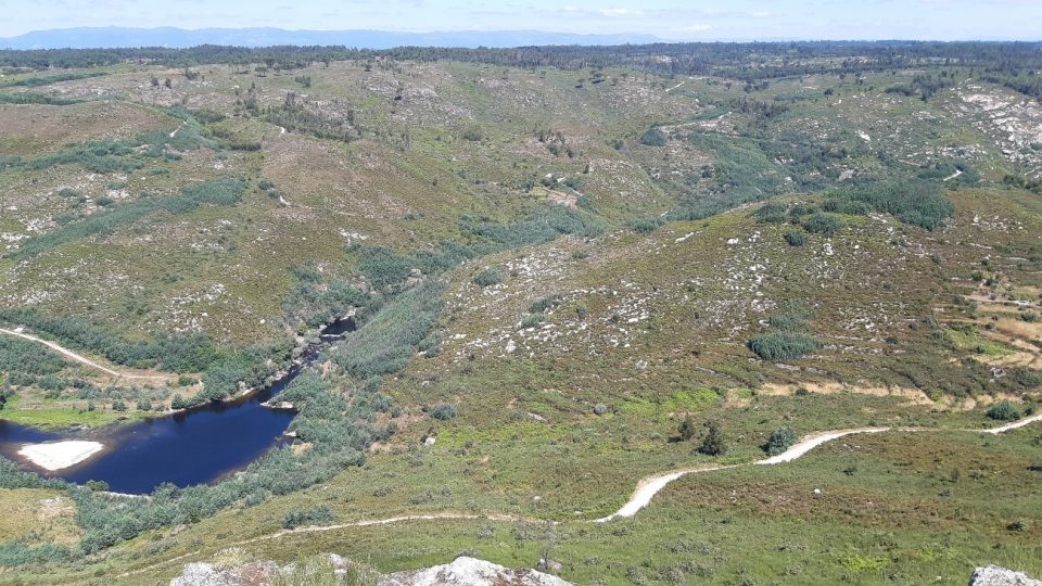 Ao lado direito, acima do meio da foto, por debaixo do tufo visível de mimosas e silvados, no alto desse morro, jazem enterrados – abandonados – os vestígios do “Castro do Vieiro” (ou do Crasto, como por aqui também se pronuncia), uma primitiva aldeia castreja cujo início murado remonta a uns 3 000 anos atrás.