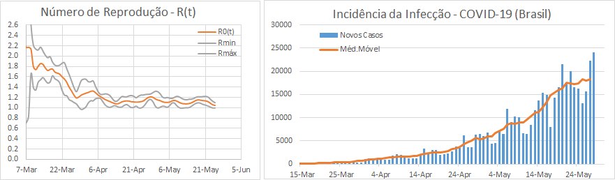 O Brasil atingiu pela primeira vez o valor mínimo de R0 a 14 de Abril, na zona de 1.1. Nessa altura estava com uma média de 1800 novos casos e um total de 25 mil casos acumulados. Desde aí o R0 andou quase sempre acima desse valor, tendo voltado a verificar-se a 15 de Maio, e agora nos últimos dias, mas sempre sem ultrapassar 1.2. Com isto, e apesar de ser um valor baixo, o Brasil encontra-se agora com a média de cerca de 18 mil casos diários e um total acumulado de 450 mil casos e mais de 27 mil mortes.